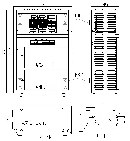 壁挂式电源柜的外形尺寸为:800x560x265(高x宽x深)如下图(标准单位:mm),机柜配备两层电池格,共可安装18节12V/20Ah电池,20Ah以上电池需另外配置电池柜。